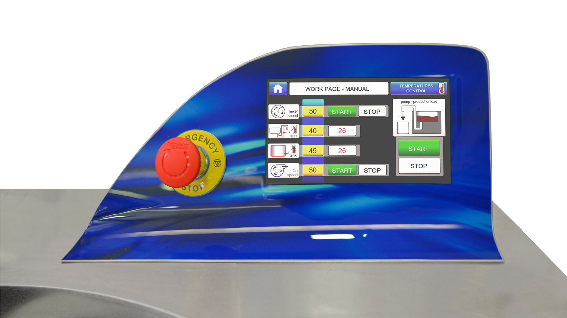 The touch screen control panel, which is located on the front of the machine, enables the operator to customise four aspects of the machine’s operation: duration, temperature, emulsion intensity and oxygenation by means of variable air flow.